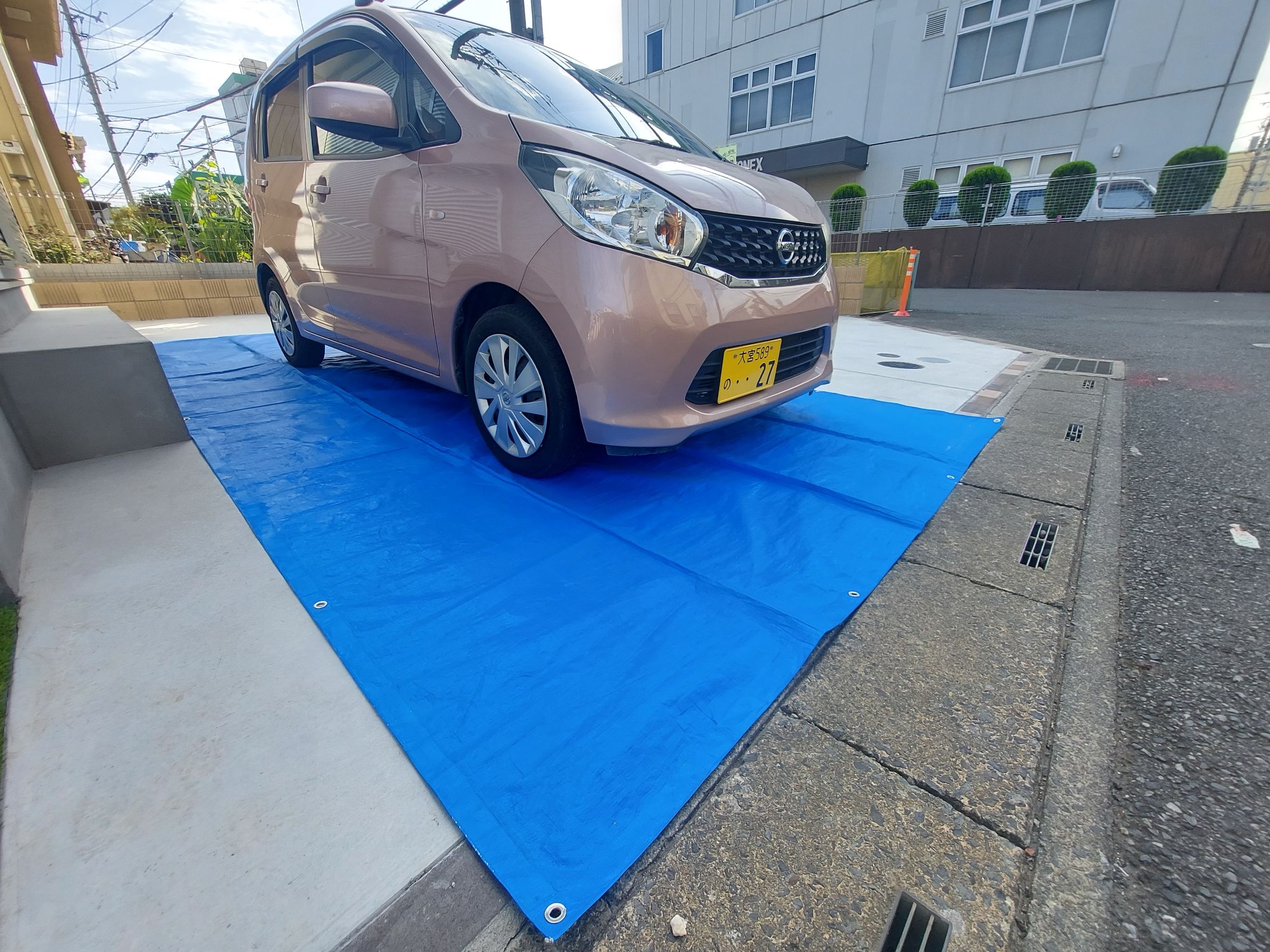 弊社は、新築のお客様でも安心してご利用いただけるように、タイヤ跡や液剤が残らないよう、ブルーシートを敷いて作業します。