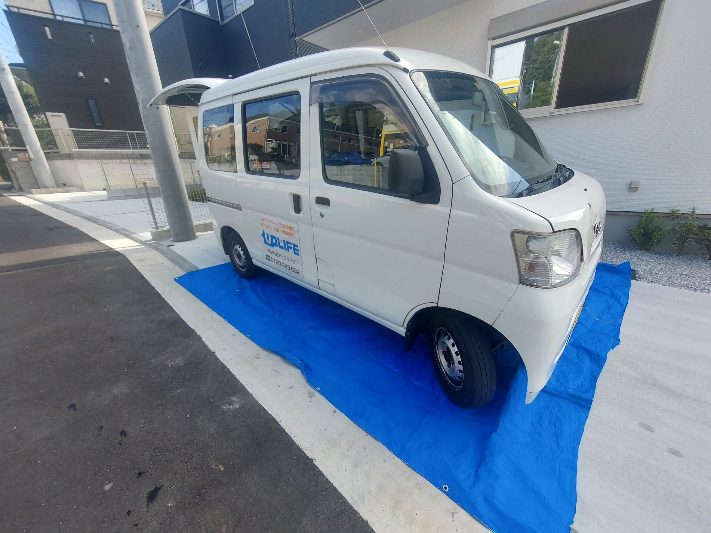 弊社は、新築のお客様でも安心してご利用いただけるように、タイヤ跡や液剤が残らないよう、ブルーシートを敷いて作業します。