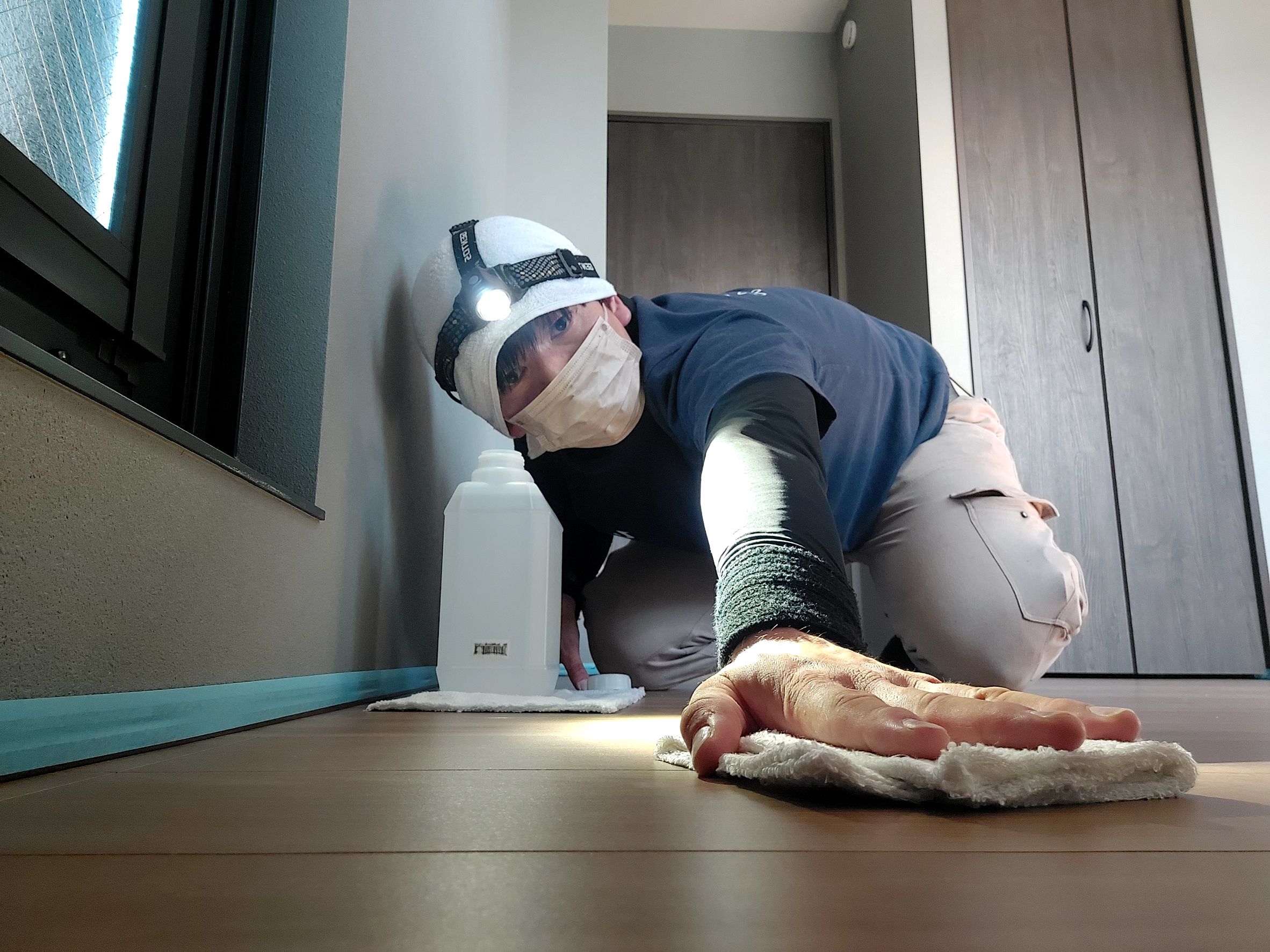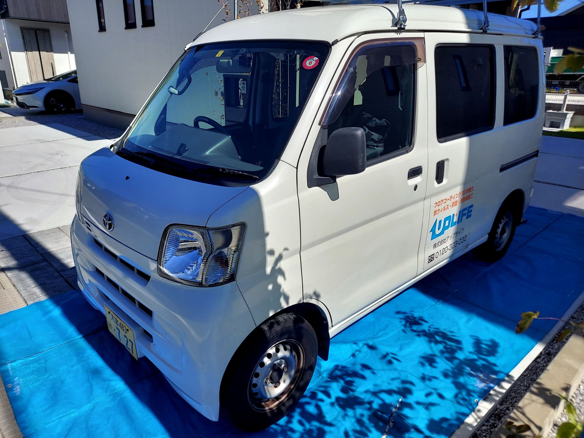 弊社は、新築のお客様でも安心してご利用いただけるように、タイヤ跡や液剤が残らないよう、ブルーシートを敷いて作業します。