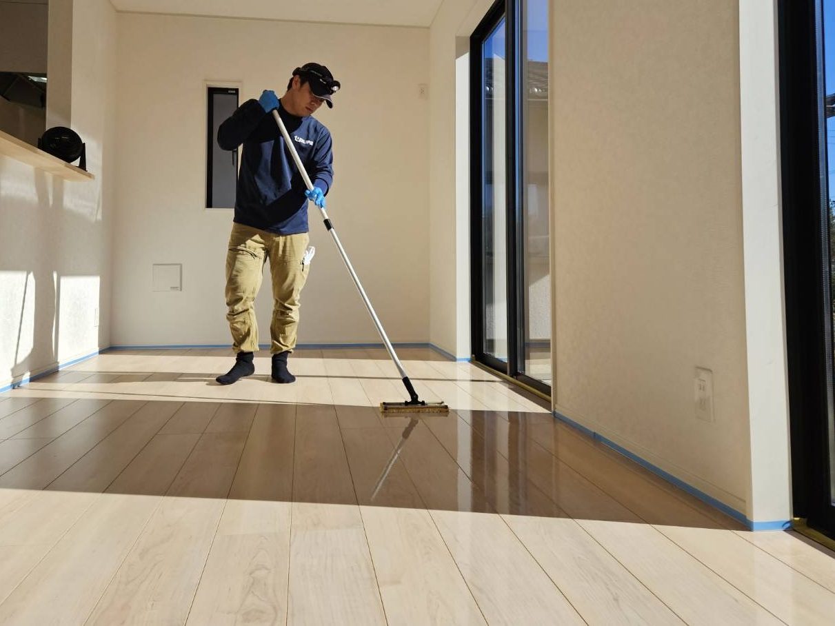 今回は埼玉県比企郡川島町にある新築戸建てのお宅へ、フロアコーティング(ガラスコーティング)の施工でお伺いしました。