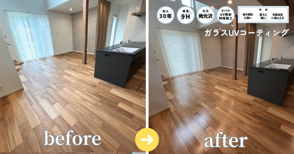 天然木や鏡面フロアなどは、紫外線や薬品に弱く、キズもつきやすい傾向。コーティングで“長期保護”する価値があります。